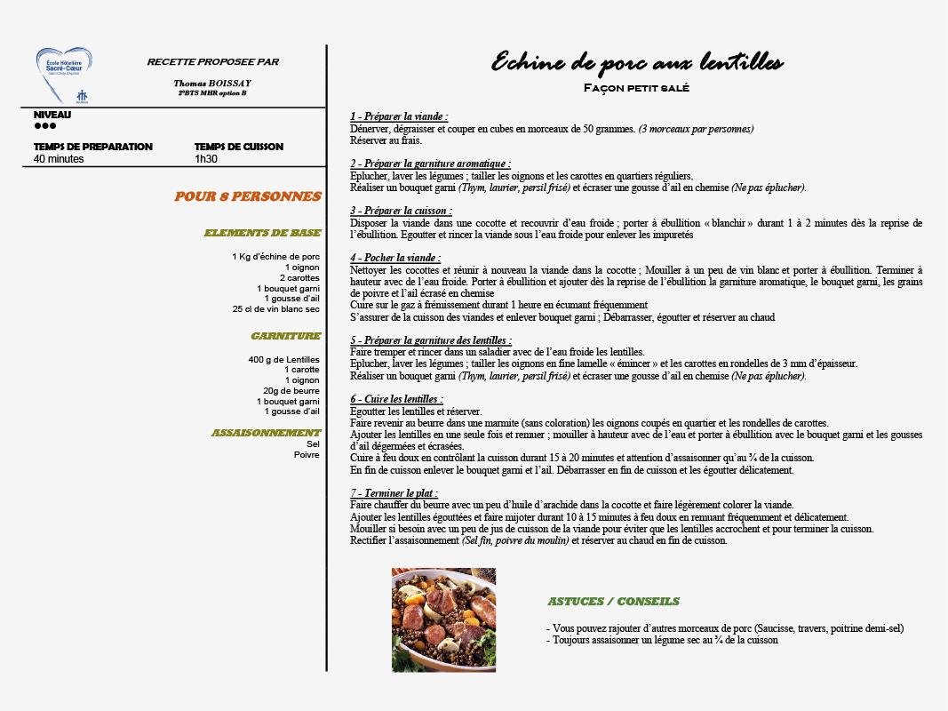 Aujourd'hui, c'est Thomas, en 2BTS MHR option B, qui vous présente sa recette de l'échine de porc aux lentilles.