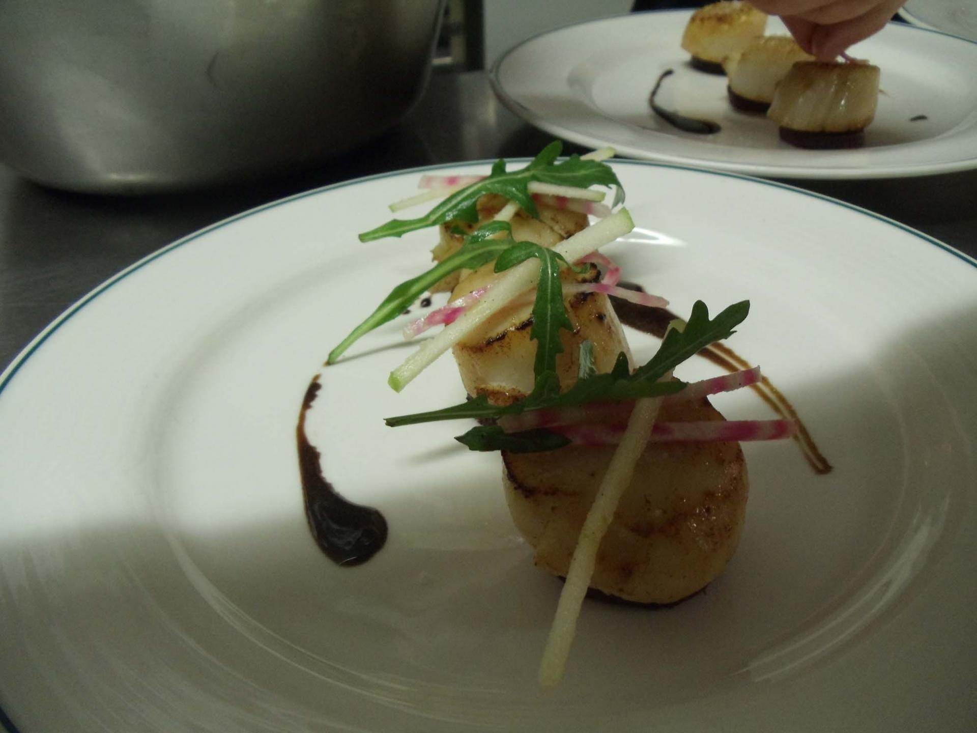 La mise en bouche pour les débuts du cinéma en noir et blanc : un éclair noir, crème fouettée à la truffe. Avec l’apparition de la parole des Saint Jacques, betterave et crème de raifort.