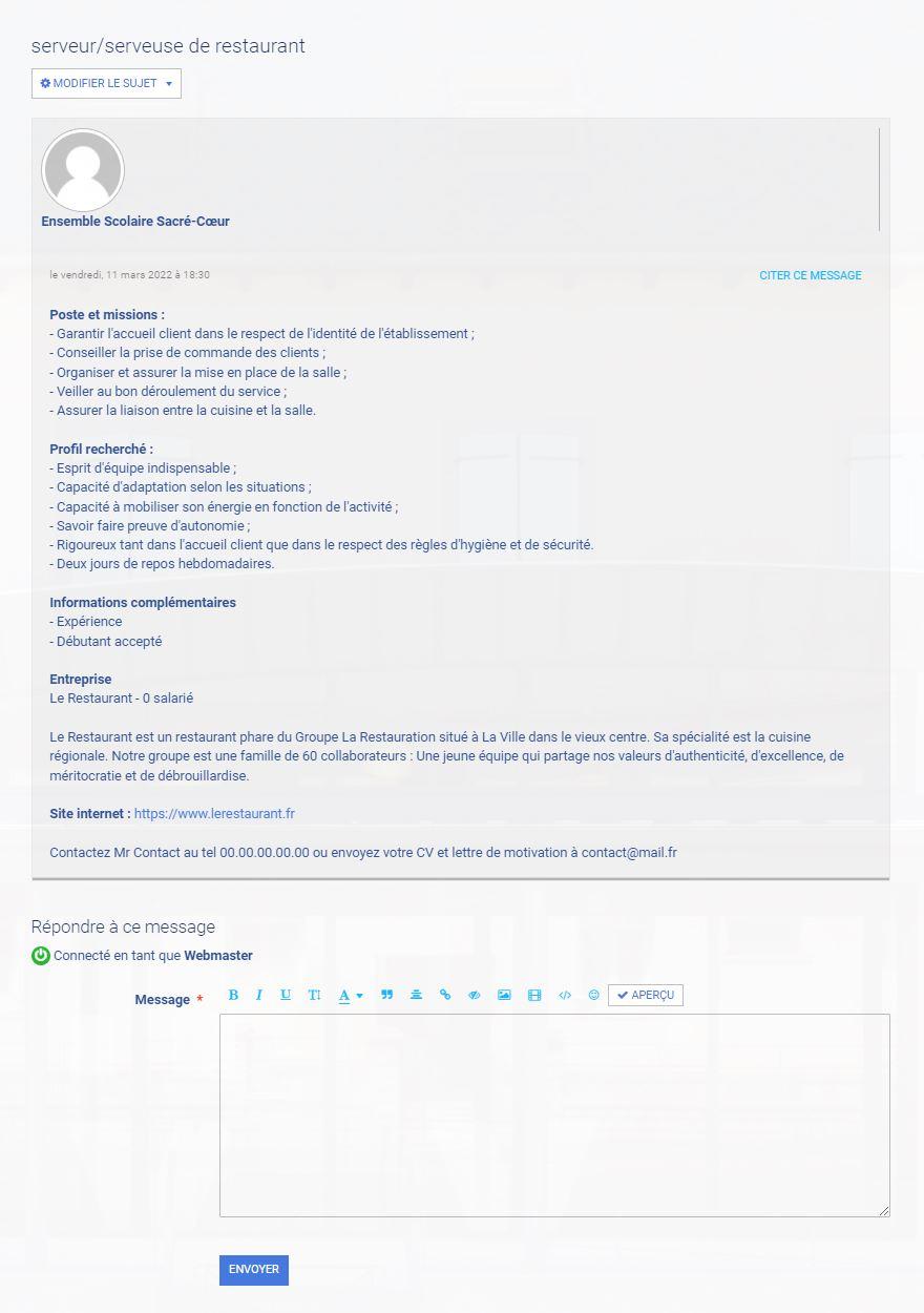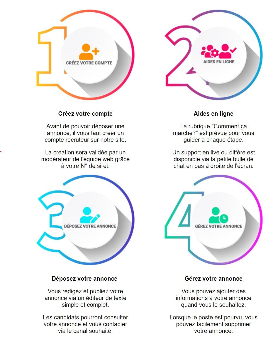 Une fois votre compte validé, vous pourrez ajouter de nouvelles offres rapidement en accédant directement à votre compte recruteur grâce à votre identifiant et au mot de passe choisi, mais aussi modifier et supprimer vos offres une fois pourvues. Pour vous accompagner, un support live (ou différé), peut être activé via la petite bulle de chat en bas à droite de votre écran.